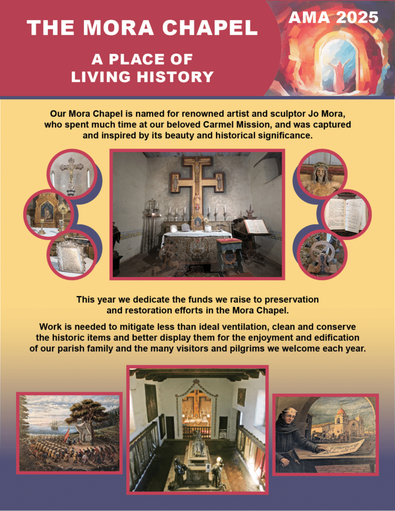 At Carmel Mission, we are proud of our rich history and the significant accomplishments of our saint, Junipero Serra. It is amazing to consider that in our Mora chapel are items he himself used every day to worship the same God, in many of the same ways as we do today. They form a living history for our church, our community, our state, and our nation. Preserving this for future generations is only possible with your generous support, so I am appealing to you today to participate in our 2025 AMA Campaign – The Mora Chapel – A Place of Living History.