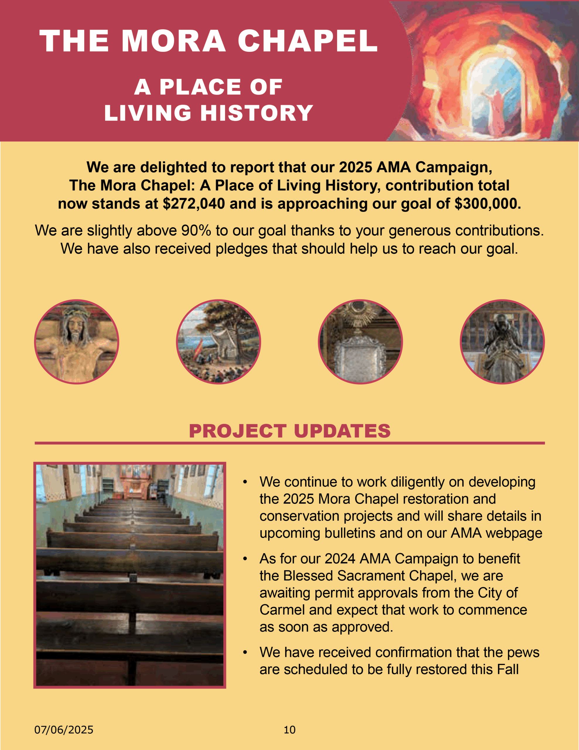 We are nearing the halfway point of our Annual AMA Campaign for 2025 The Mora Chapel – A Place of Living History. We are at 56% of our goal! There will be a presentation about our 2025 AMA Campaign, The Mora Chapel – A Place of Living History, at Masses.